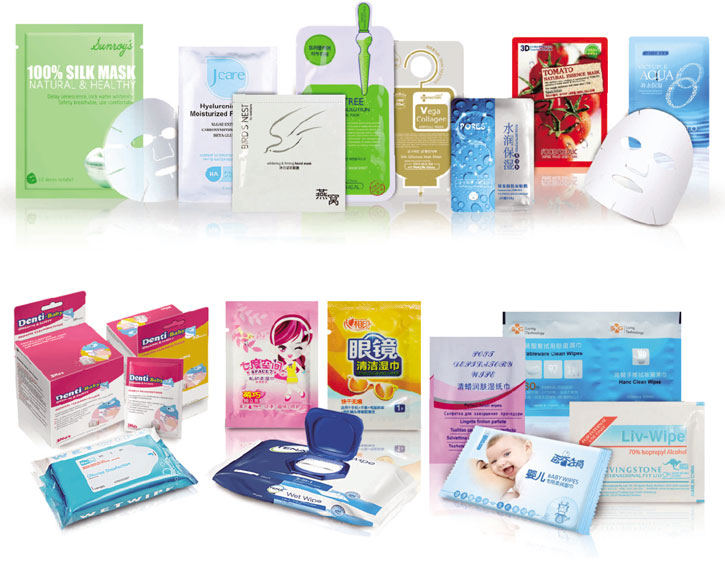 公司主打产品VPD系列湿巾包装机集光、电、气为一体,全自动电脑控制,设计先进、质量可靠,生产效率高,产品远销世界30多个国家和地区,深受客商青睐!公司全新开发的面膜全自动生产线,能全自动的完成从无纺布滚切成型、折叠加液、消毒到袋包装、装盒、塑封、成品输出,一气呵成,减少了人工封装的麻烦和二次污染。该设备荣获多项国家发明专利和荣誉,市场反应良好!